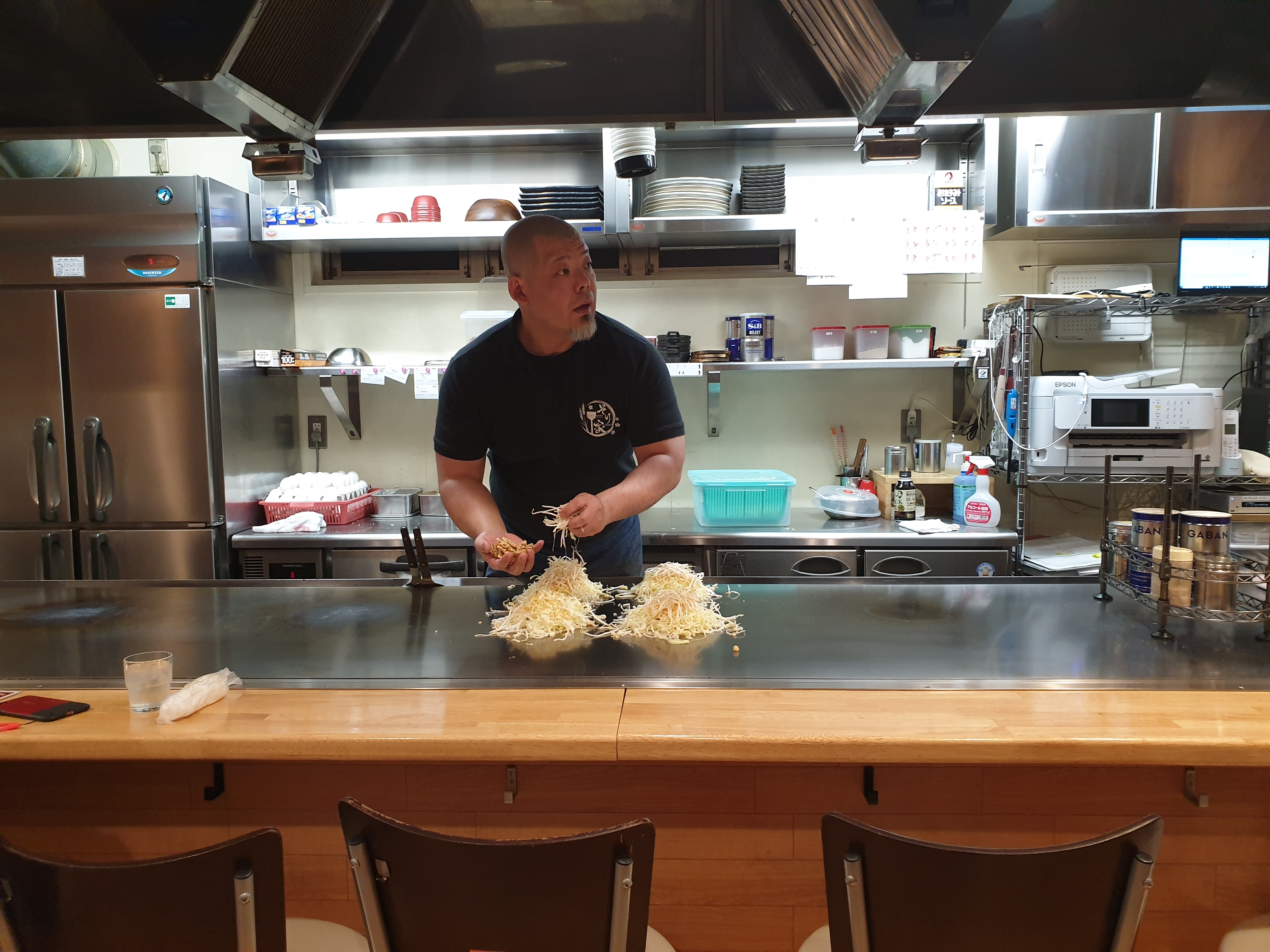 Wracając do naleśników, kucharz smaży małego cieniutkiego naleśnika na długim rozgrzanym blacie, siedząc bezpośrednio na przeciwko kucharza lepiej uważać, by się nie poparzyć od nagrzanej blachy. Następnie kładzie na niego ogromną porcję posiekanej białej kapusty, trochę kiełków i przykrywa pokrywką. Gdy kapusta zmięknie obraca całość i dalej smaży. Obok smaży wybrane dodatki np. bekon, jajko, krewetki i najważniejsze makaron udon (japoński) bądź soba (chiński). Gdy wszystkie składniki są gotowe, układa makaron na naleśniku z kapustą, na wierzch kładzie bekon/jajklo/krewetki, polewa sosem i podaje. Przyznamy, że danie nie przypadło nam do gustu. Zjedzone, zaliczone, ale nie będziemy go ponownie szukać 🙂