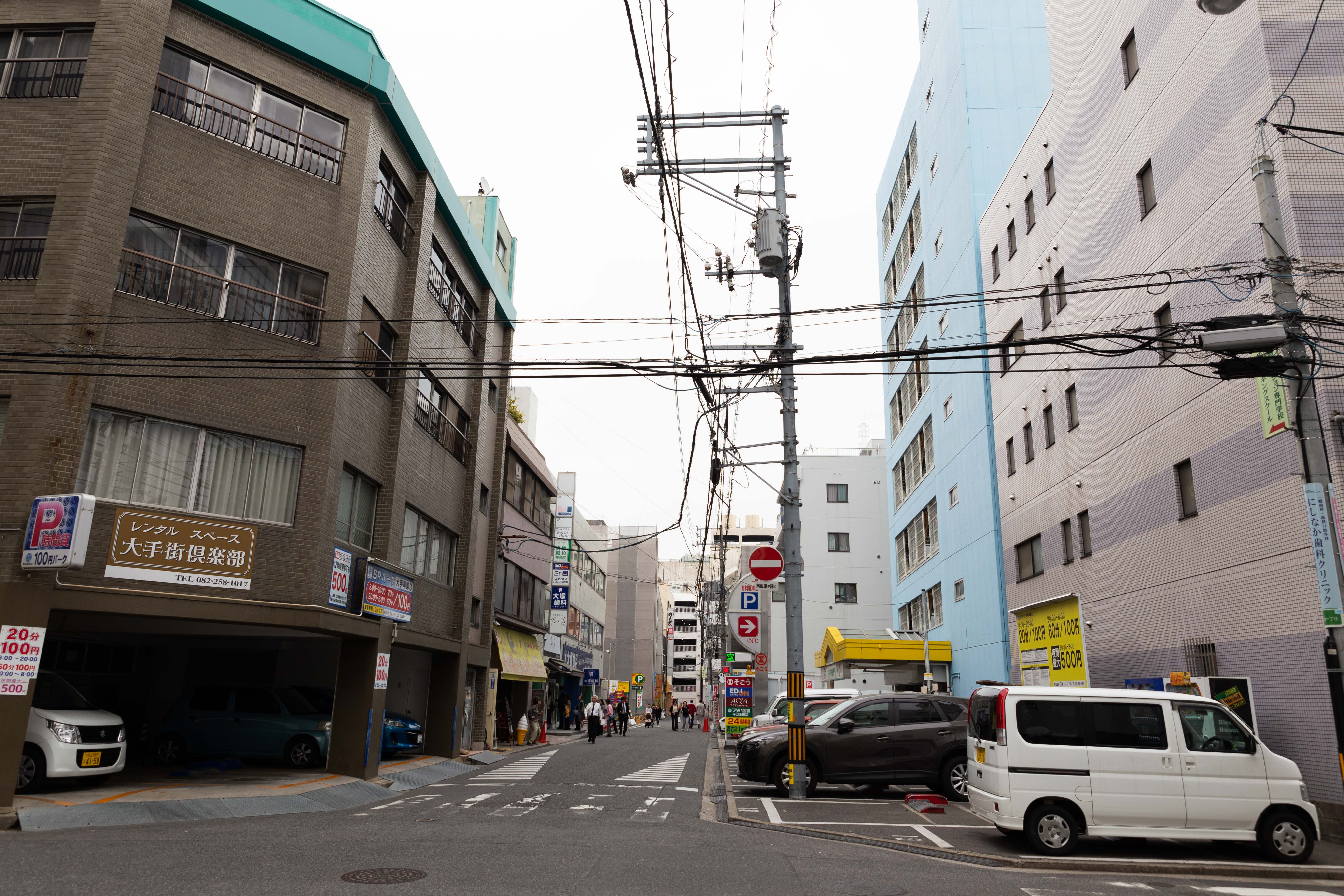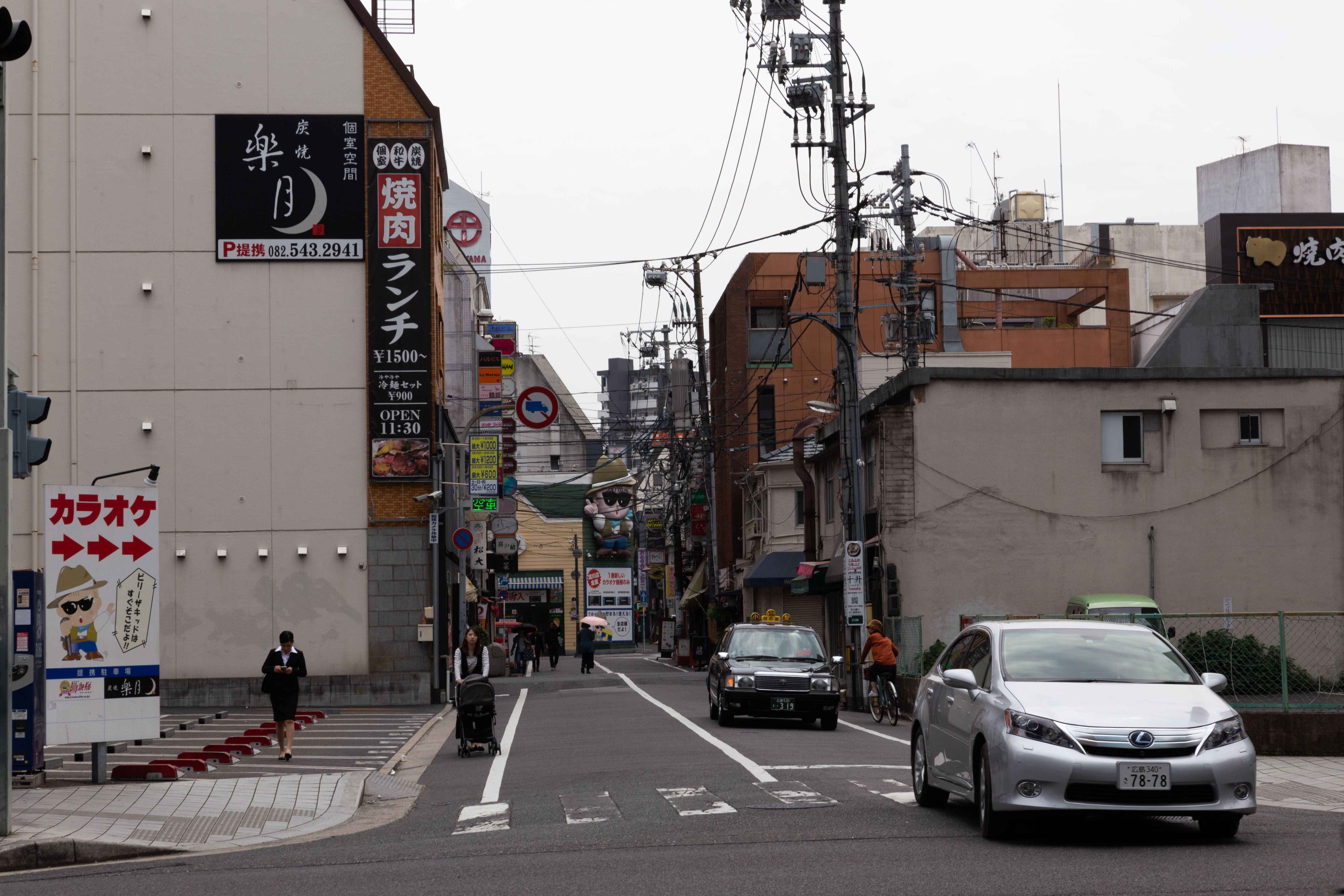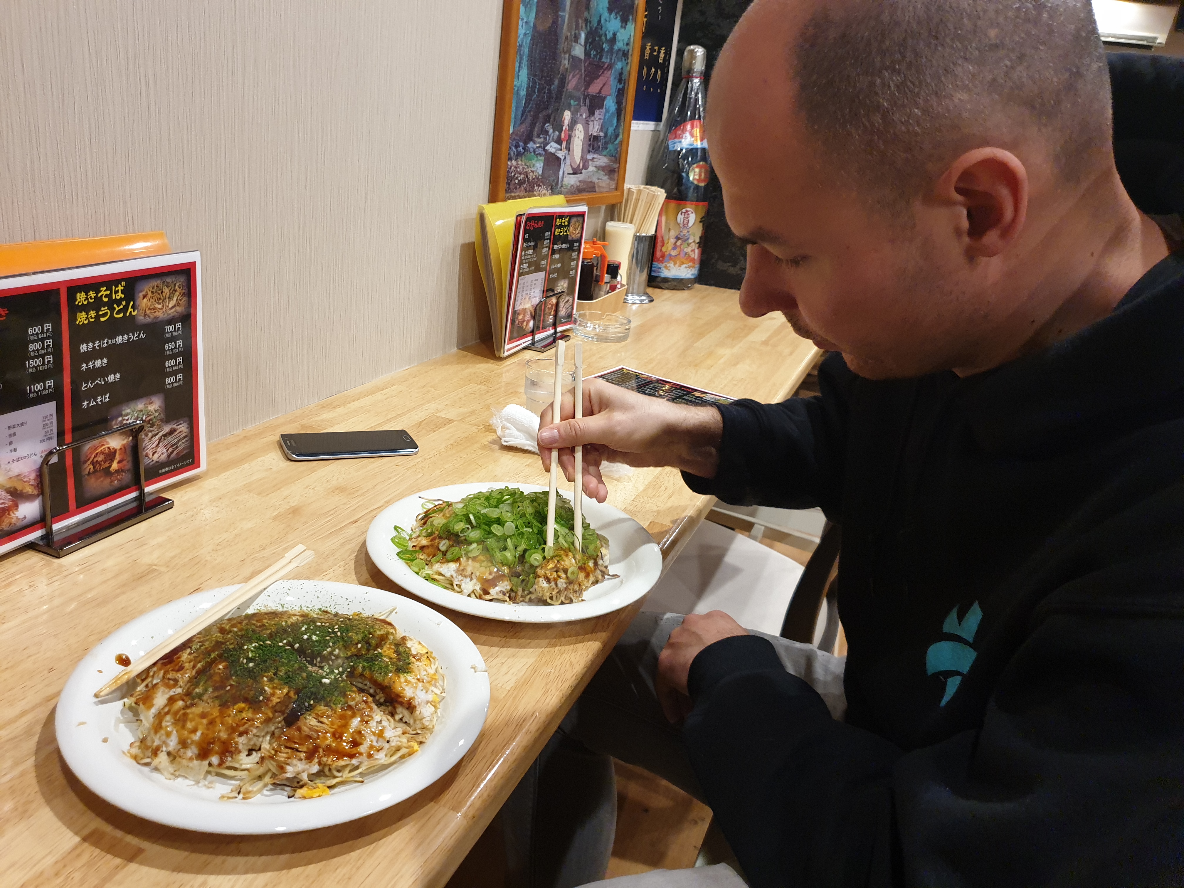 Zanim dotarliśmy do zamku zjedliśmy tradycyjne hiroszimskie naleśniki – Okonomiyaki. Weszliśmy do baru, który napotkaliśmy po drodze, na szczęście okazało się, że kucharz mówi trochę po angielsku i mają dostępne anglojęzyczne menu. Zamówiliśmy najbardziej klasyczne wersje naleśników, choć według nas nie mają za wiele wspólnego z naleśnikami. Poza nami w barze siedzieli tylko Japończycy w garniturach, którzy przyszli na kolacje po długim dniu pracy.