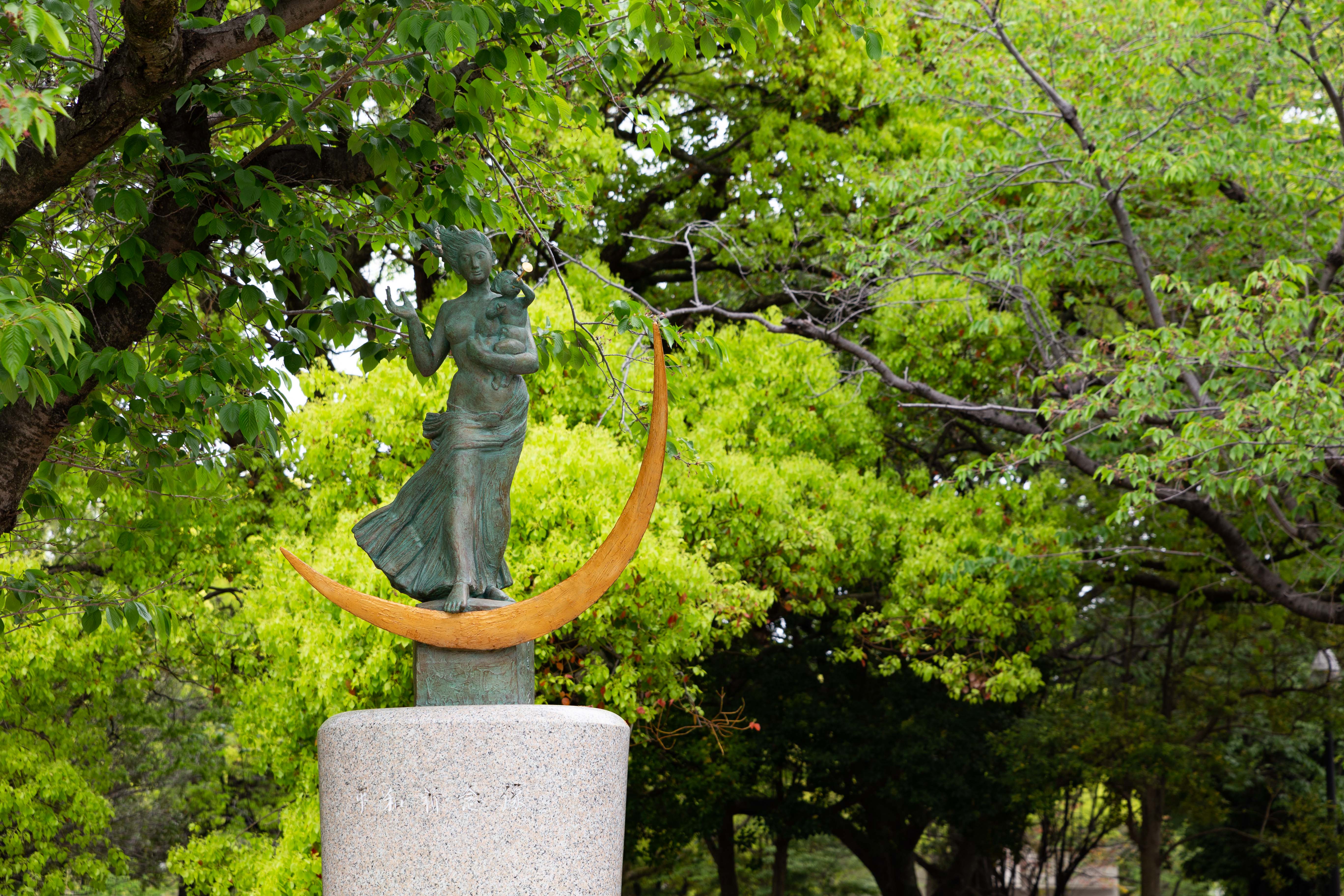 W parku znajduje się kilka rzeźb i pomników poświęconych różnym grupom np. koreańskim przymusowym pracownikom czy studenom. Jedna z najbardziej charakterystycznych rzeźb to ta przedstawiająca Sadako Sasaki – dziewczynkę, która cierpiała z powodu białaczki, będącej efektem napromieniowania. Wierząc legendzie postanowiła ona złożyć tysiąc żurawi origami, by spełniło się jej życzenie o zdrowiu. Niestety nie osiągnęła swojego celu, ale po jej śmierci dzieło ukończyli jej koledzy i koleżanki. Obecnie papierowe prace origami przysyłają dzieci z całej Japonii.