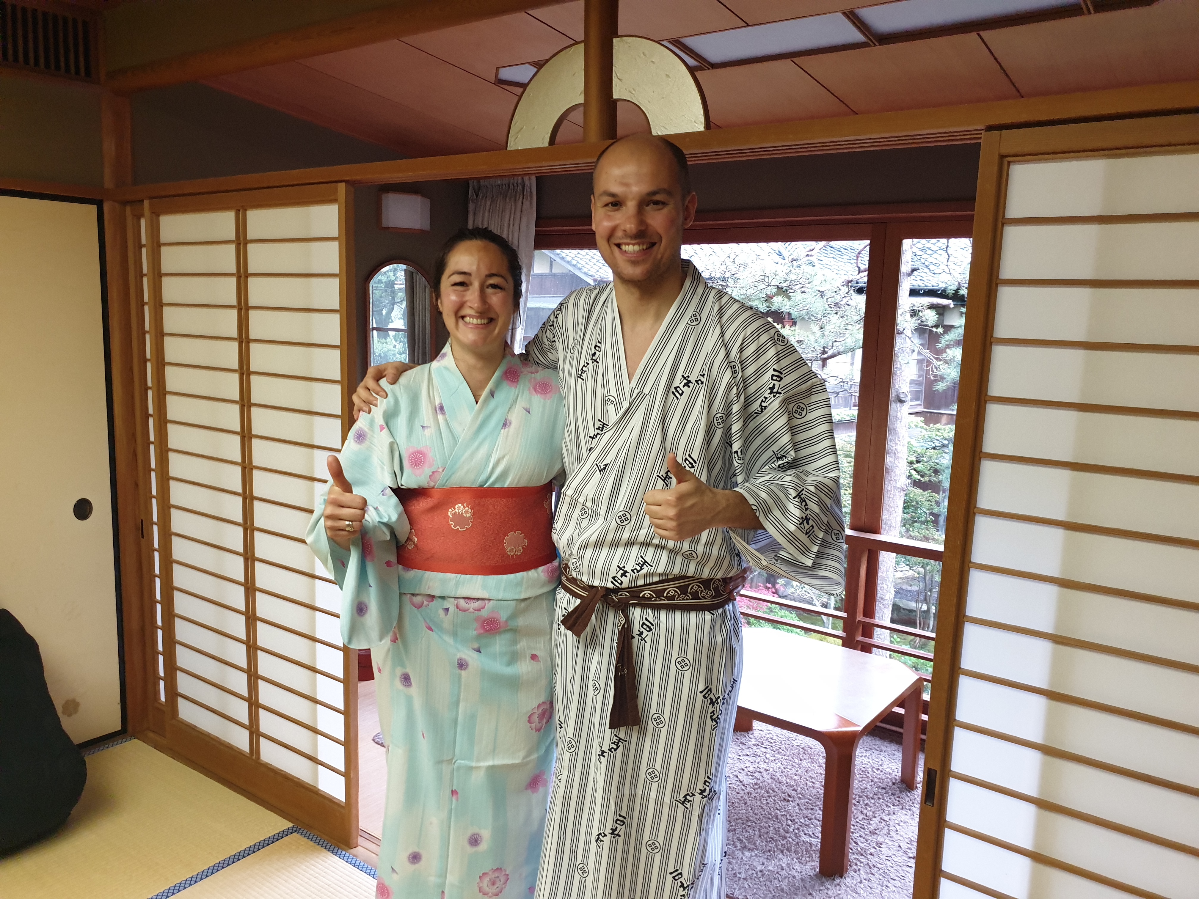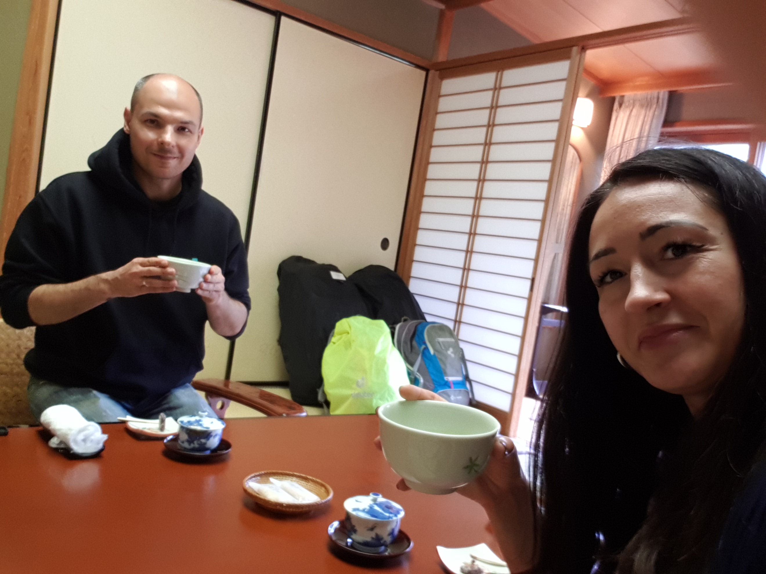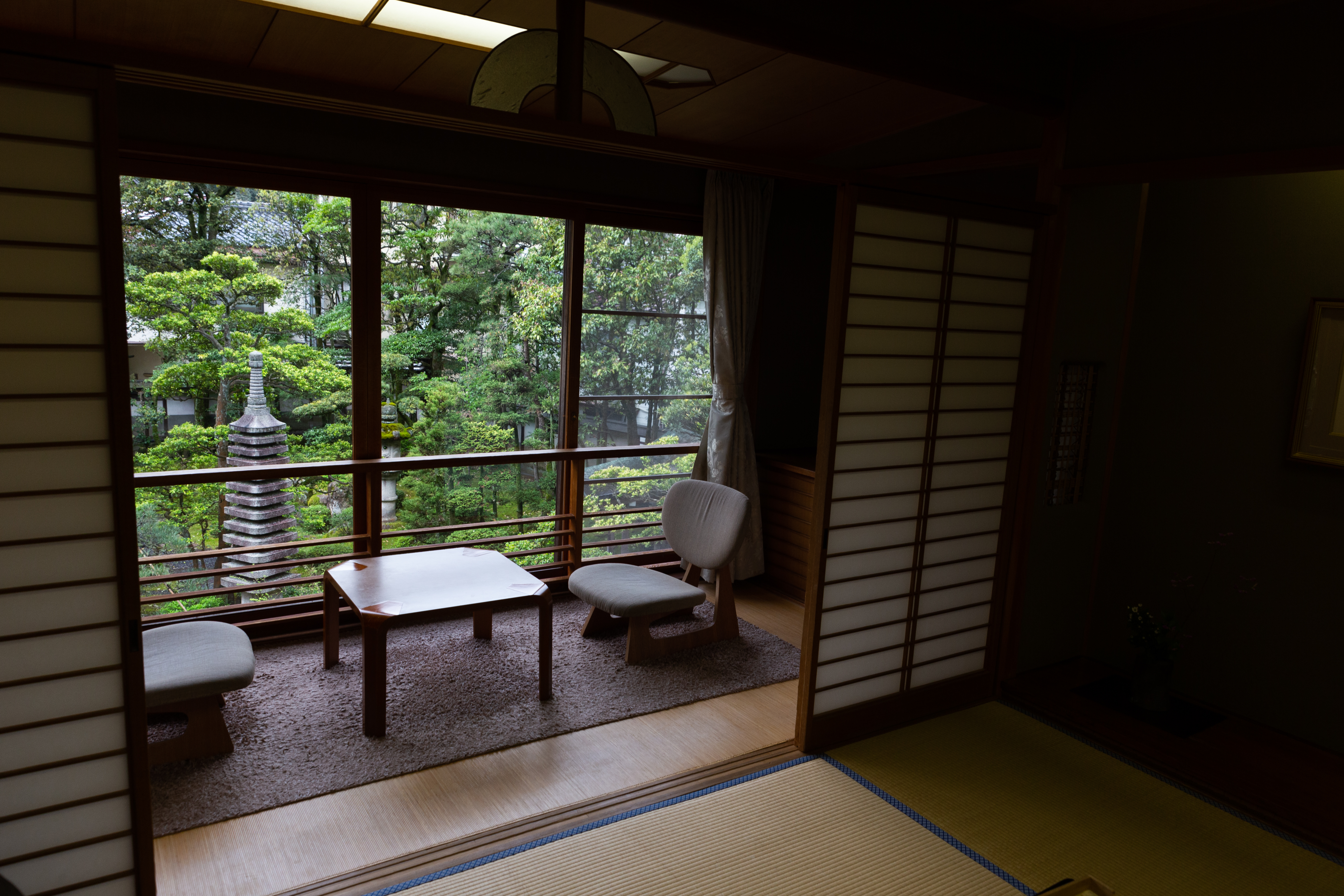 Ryokan to tradycyjna japońska gospoda świecki odpowiednik shukubo (czyli noclegu w świątyni buddyjskiej). Hotel, który wybraliśmy oferuje zakwaterowanie właśnie w takim stylu. Nasz pokój znajdował się na piętrze, a z okna mogliśmy podziwiać przepiękny widok na ogród i pobliskie góry. Pokój pełnił dwie funkcje: jadalni, a następnie sypialni, a rano znowu jadalni 😀
