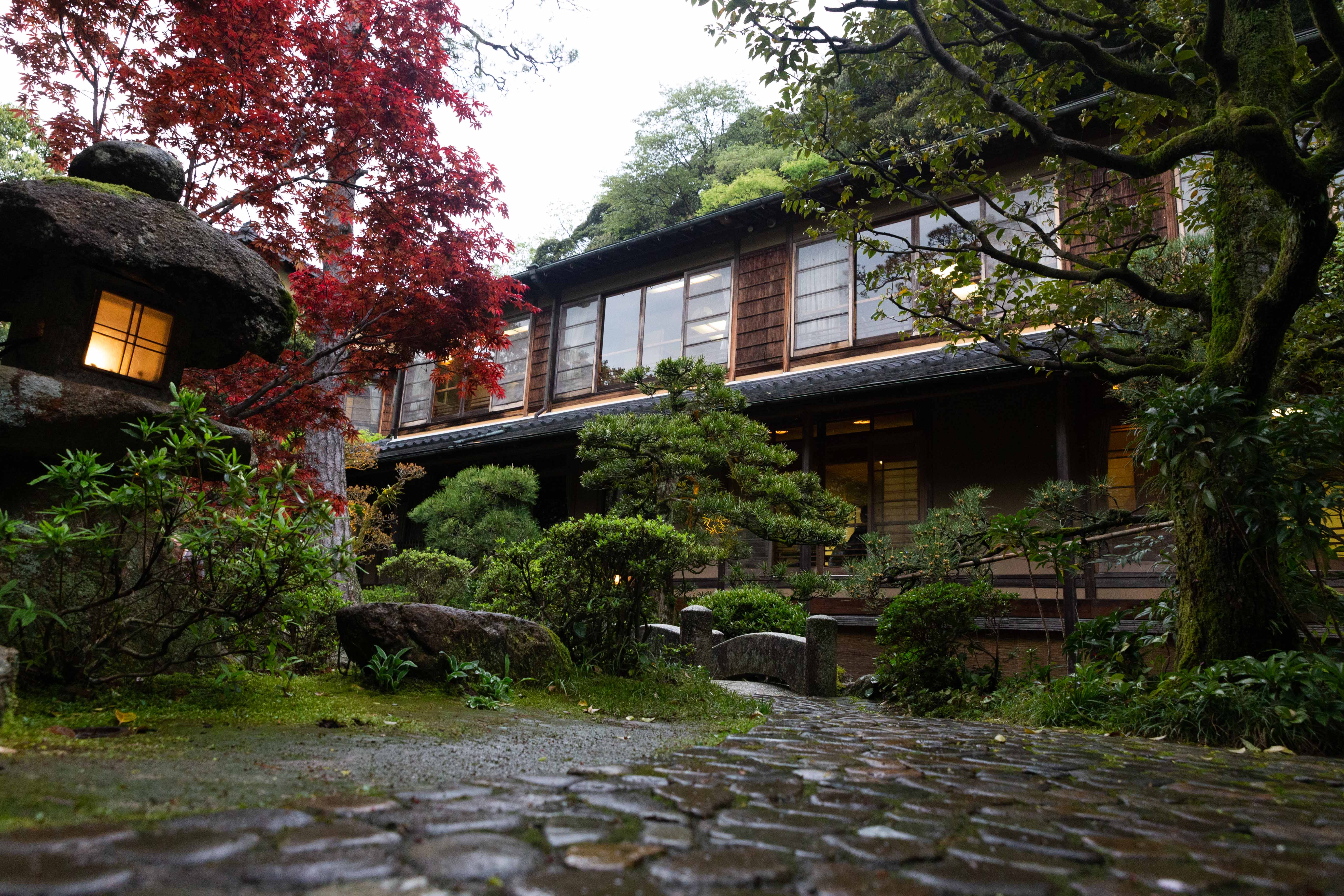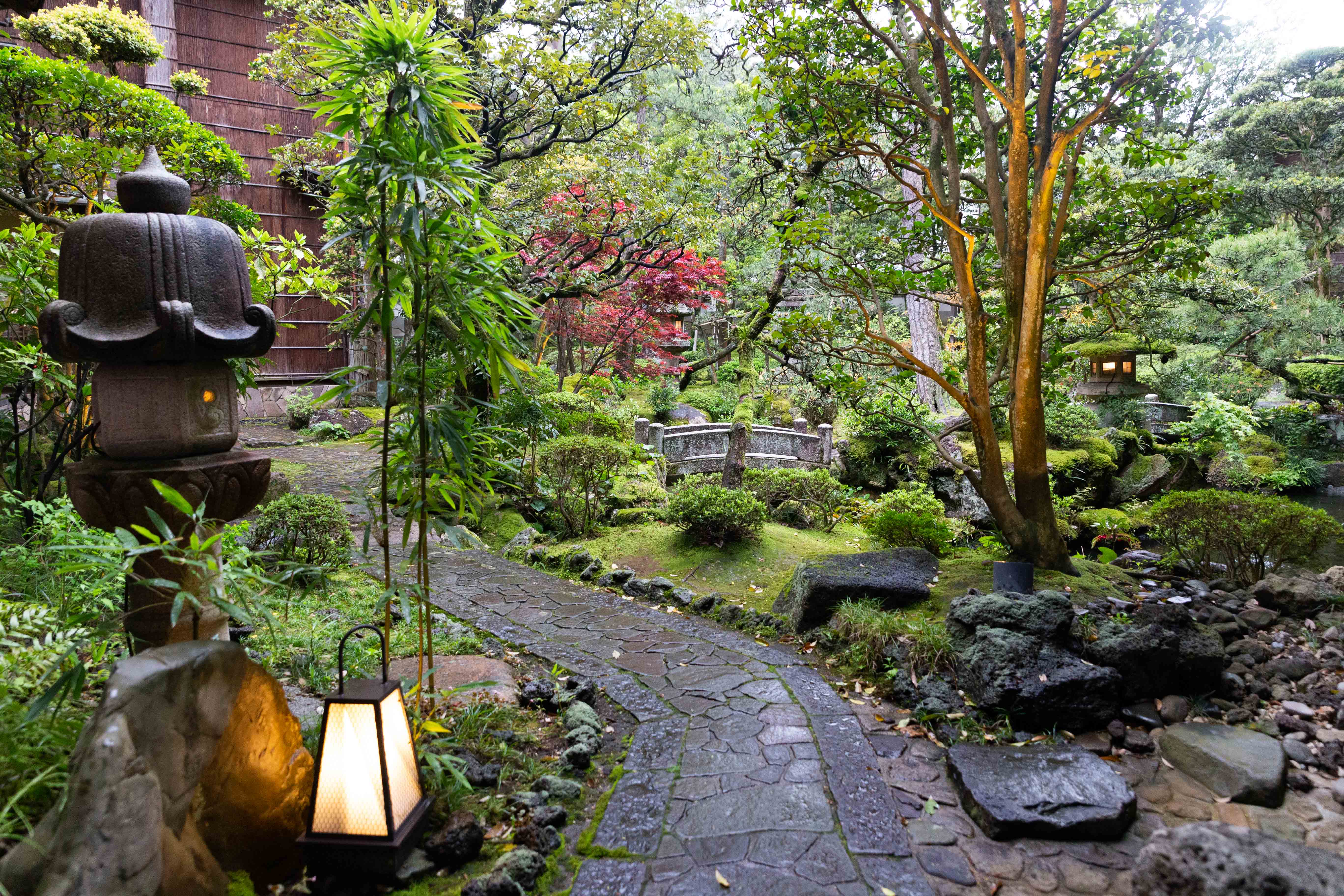 Na początku otrzymaliśmy tradycyjny poczęstunek składający się z herbaty Matcha i ciasteczek. Niestety pogoda nie dopisała, padał deszcz i wiał mocny wiatr, więc nie chcąc ryzykować nawrotu choroby poszliśmy tylko do hotelowego onsenu. W oczekiwaniu na kolację wyglądaliśmy przejaśnień, by zrobić chociaż kilka zdjęć ogrodu i naszego hotelu.
