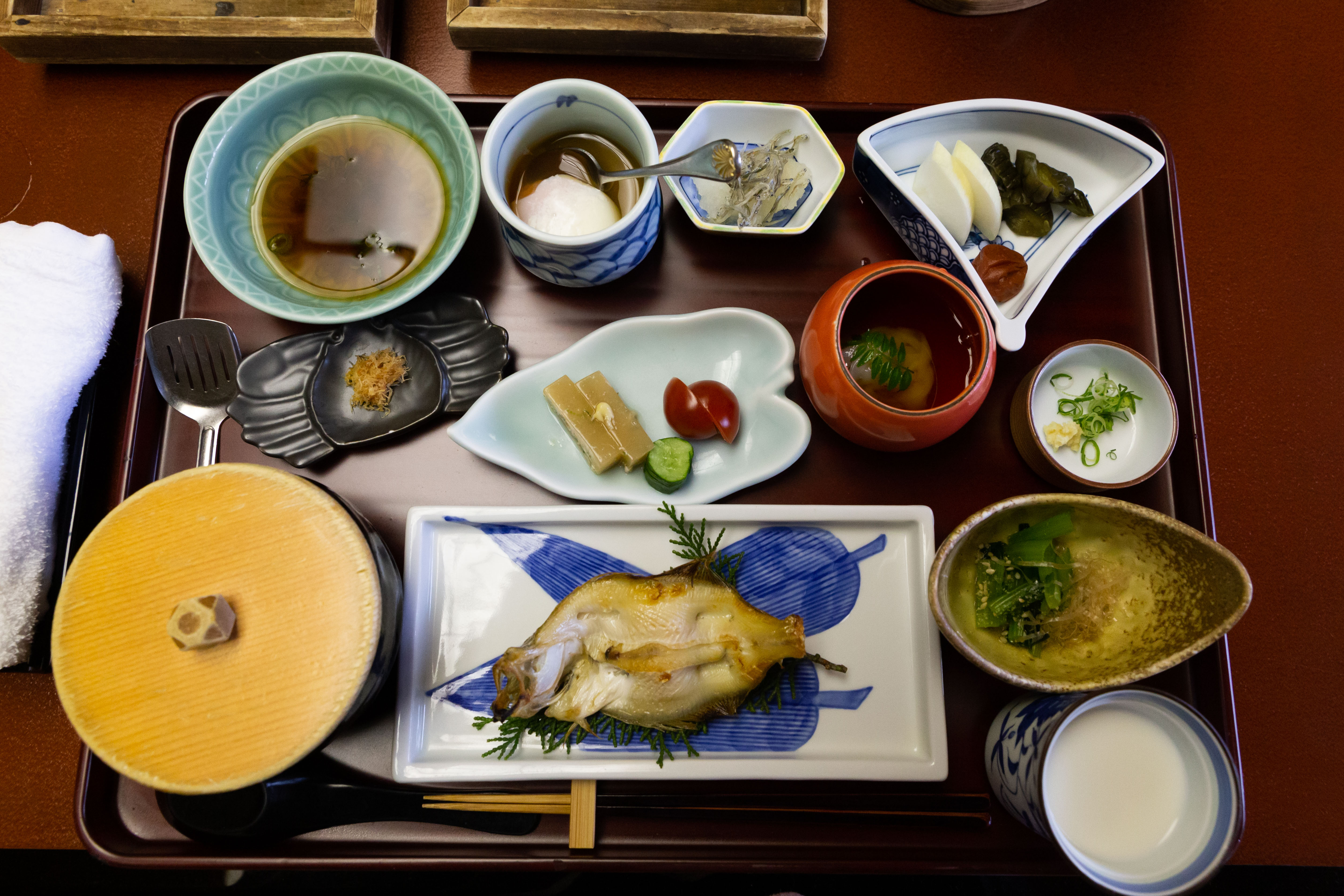 Następnego dnia rano Pani, która nas obsługiwała posprzątała futony i przygotowała śniadanie w naszym pokoju. My w tym czasie korzystając z minimalnie lepszej pogody udaliśmy się do pobliskiego publicznego onsenu. Gorąca kąpiel z widokiem na mały wodospad i las była bardzo przyjemna. Śniadanie, oczywiście tradycyjne japońskie, czekało już na nas w pokoju. Potrawy były smaczne, no może poza ryżanką (odpowiednikiem owsianki), która nie miała w ogóle smaku.