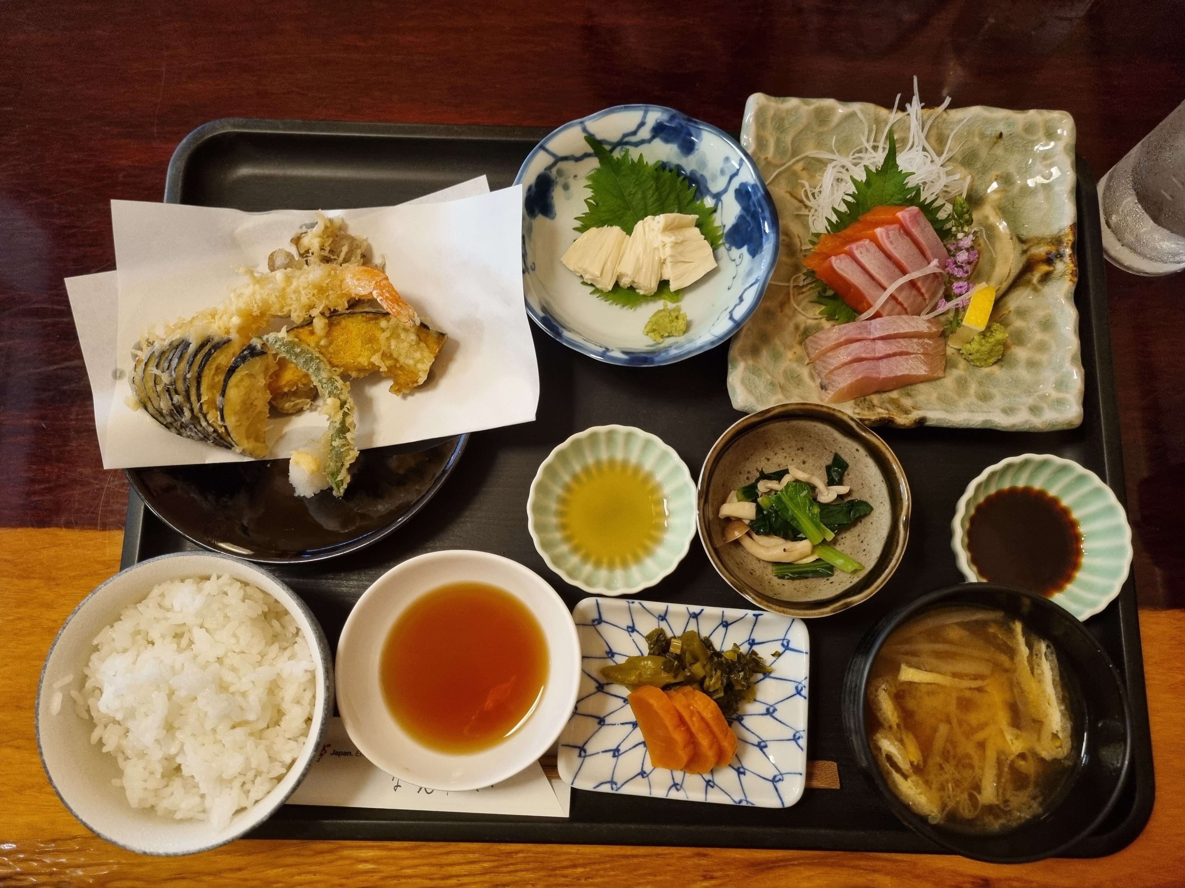A teraz czas na obiad w tradycyjnej restauracji japońskiej – zdejmujemy buty, a potem siadamy/ klękamy na poduszkach ułożonych na tatami. Pyszne sashimi z lokalnych jeziornych ryb, grillowany pstrąg, zupa miso, warzywa w tempurze, kotlet wieprzowy w panierce, marynowane warzywa, ryż i makaron soba. Delicje!