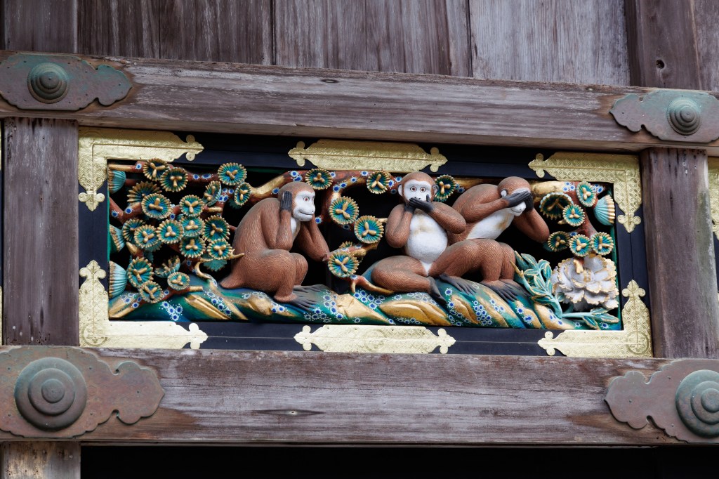A kojarzycie 3 małpki zakrywające oczy, uszy i buzię? Właśnie odkryliśmy ich pochodzenie :O Na stajni dla świętych koni wyryto cykl życia małpek. Jednym z etapów dzieciństwa jest czas, gdy małpki mają: nie patrzeć na zło, nie mówić i nie słuchać złego. Trzy powielane na figurkach małpki pochodzą z Nikko!
