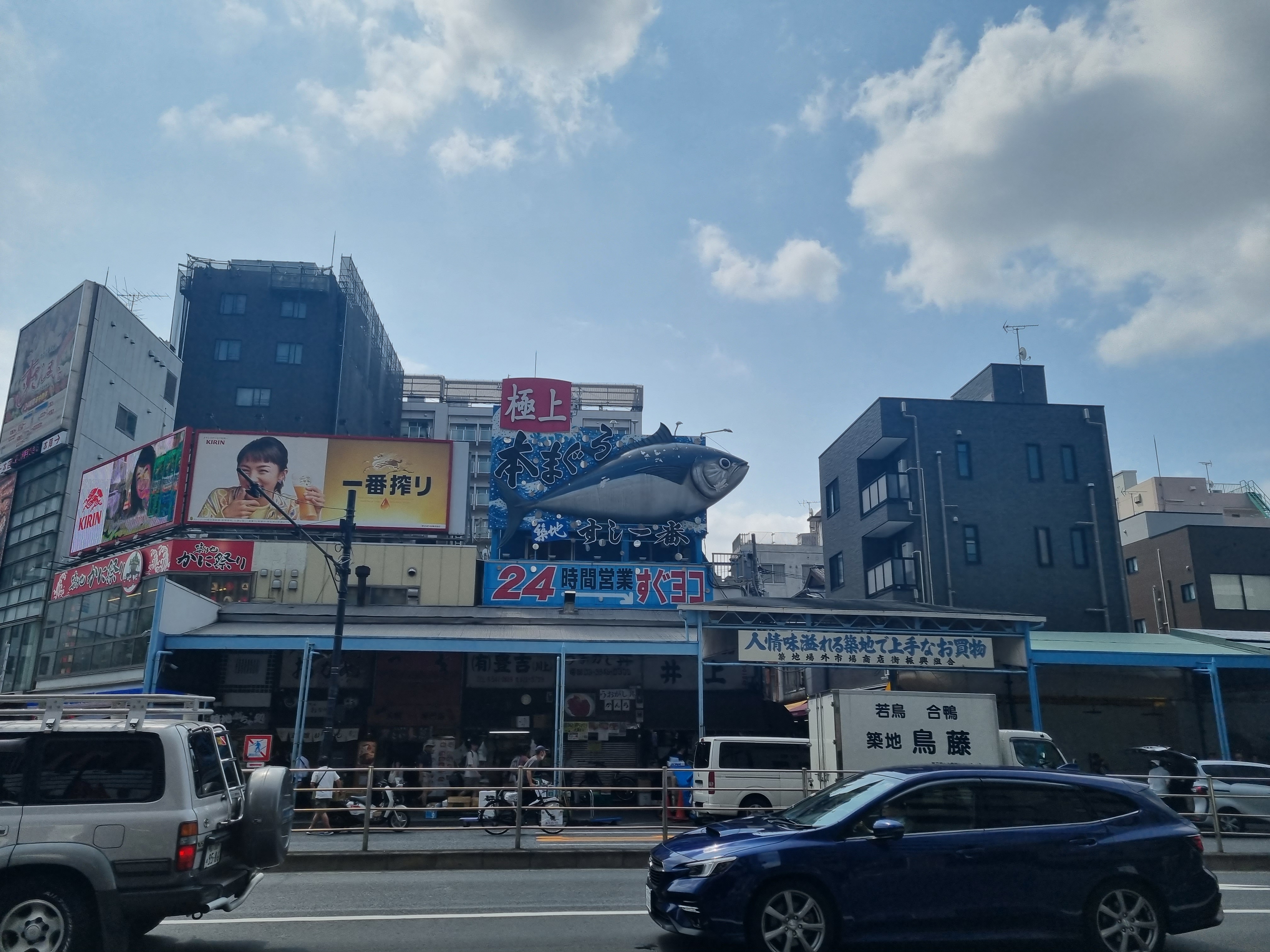 Dzisiaj w planie 3 atrakcje, tym razem mamy piękną pogodę, jest gorąco i wilgotno. Krokiem spacerowym udajemy się w kierunku targu rybnego Tsukiji na śniadanie. Po drodze odwiedzamy miejsce, gdzie jeszcze niedawno stał bardzo charakterystyczny kapsułowy blok mieszkalny (Nakagin Capsule Tower) wybudowany w latach 70-tych XXw. reprezentujący styl metabolizmu (więcej informacji na Wikipedii). 4 lata temu widzieliśmy go z Kubą na żywo. Teraz pozostała już tylko dziura w ziemi. Został zburzony, ponieważ m.in. nie spełniał norm bezpieczeństwa np. na wypadek trzęsień ziemi.