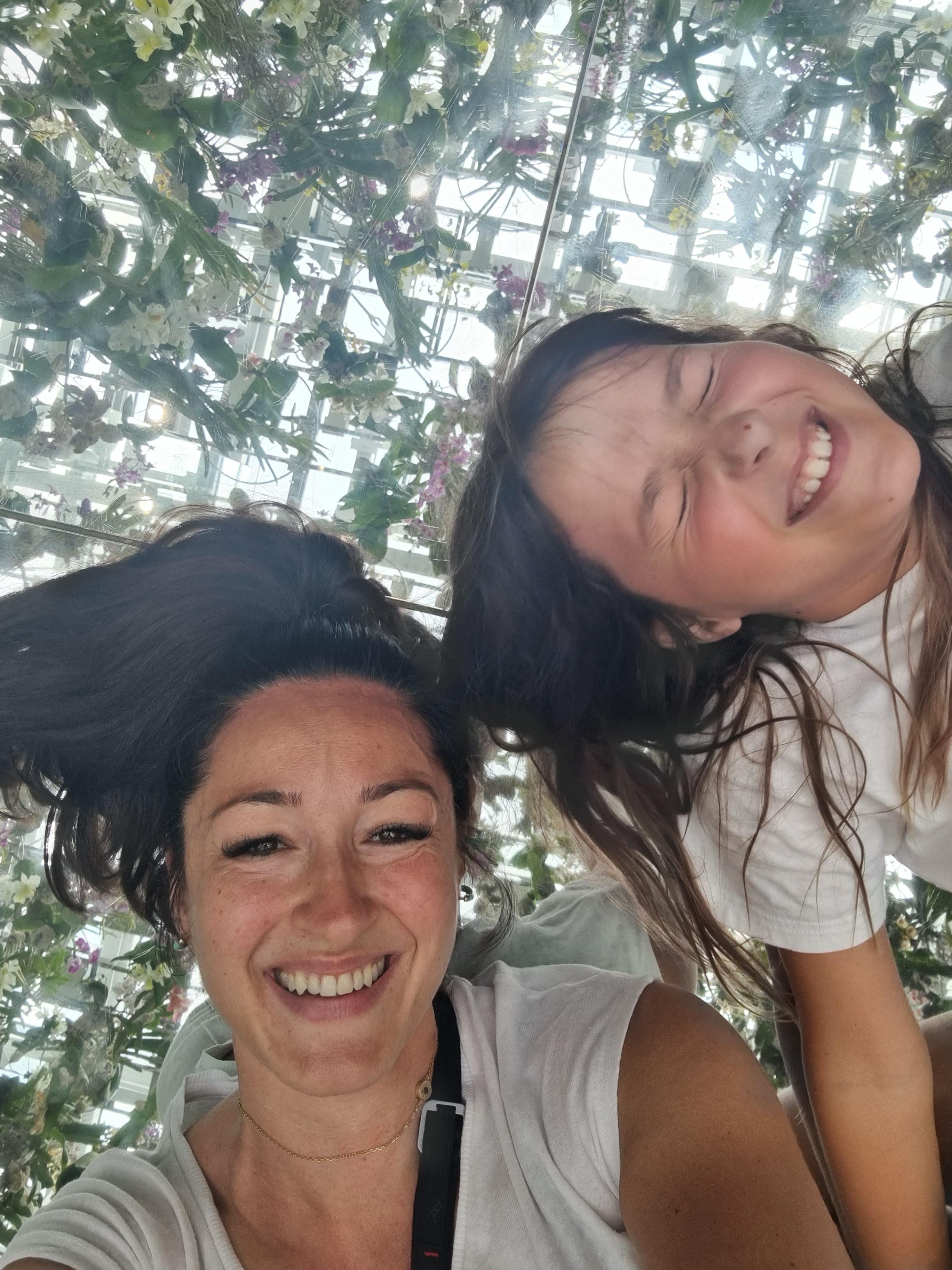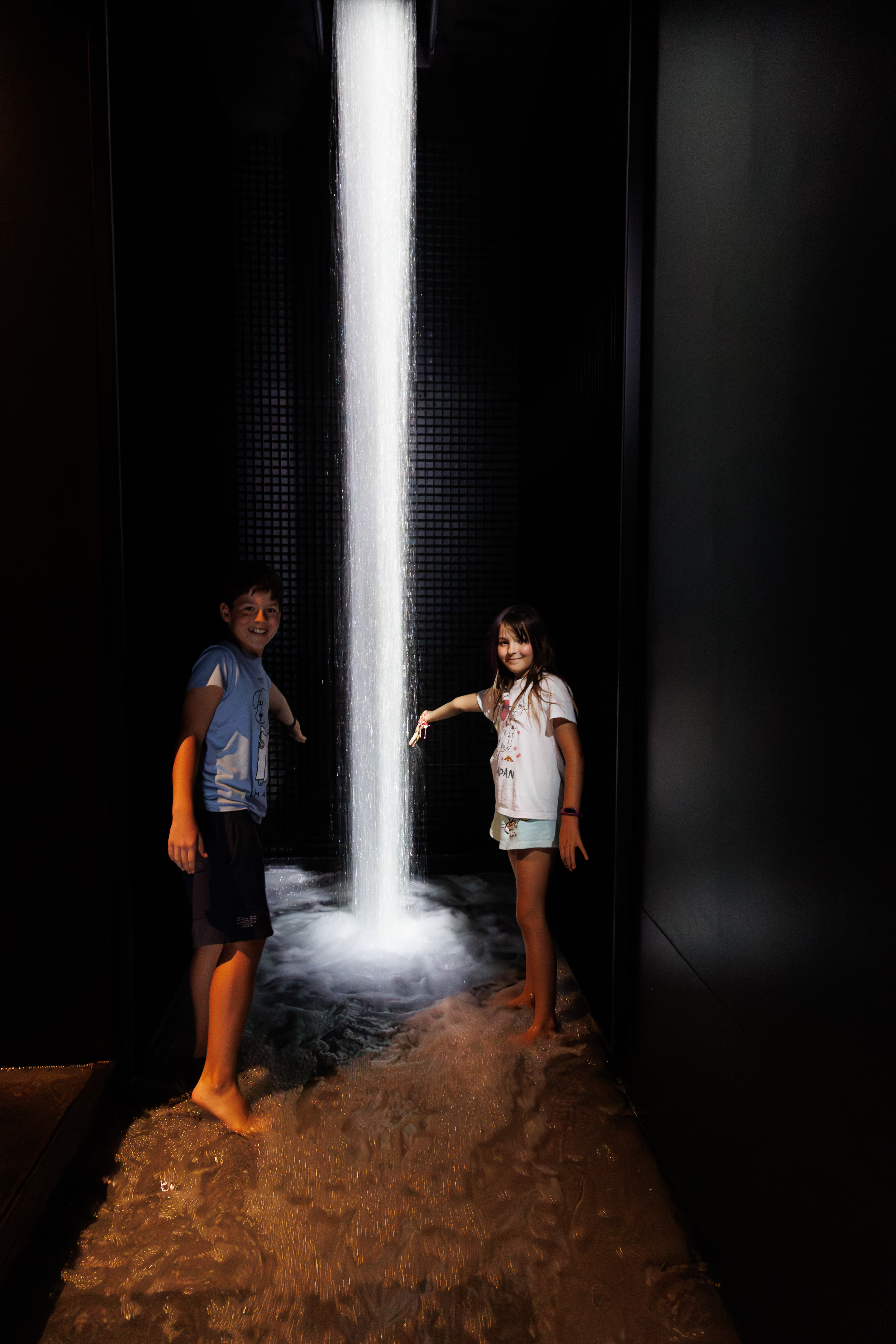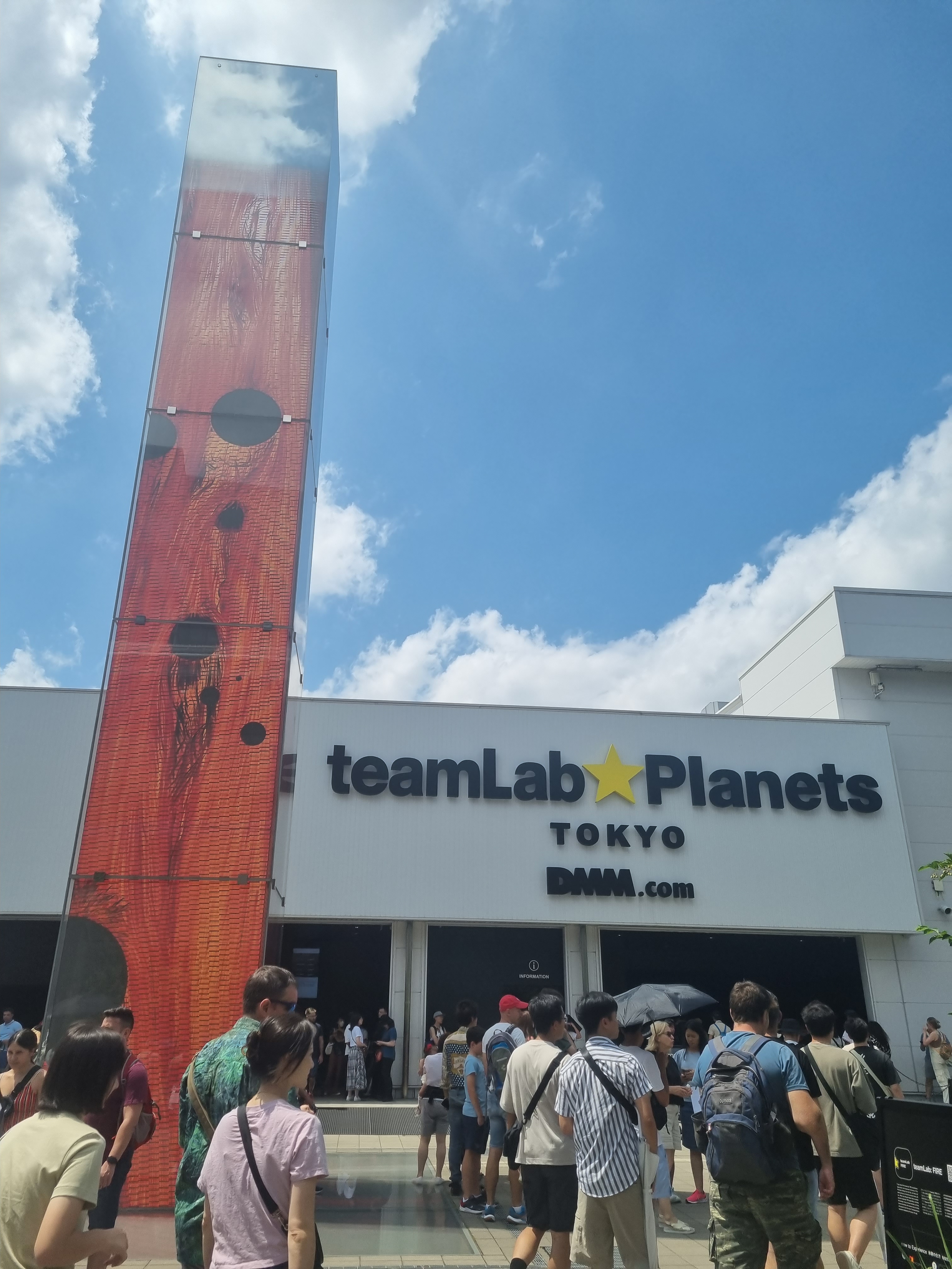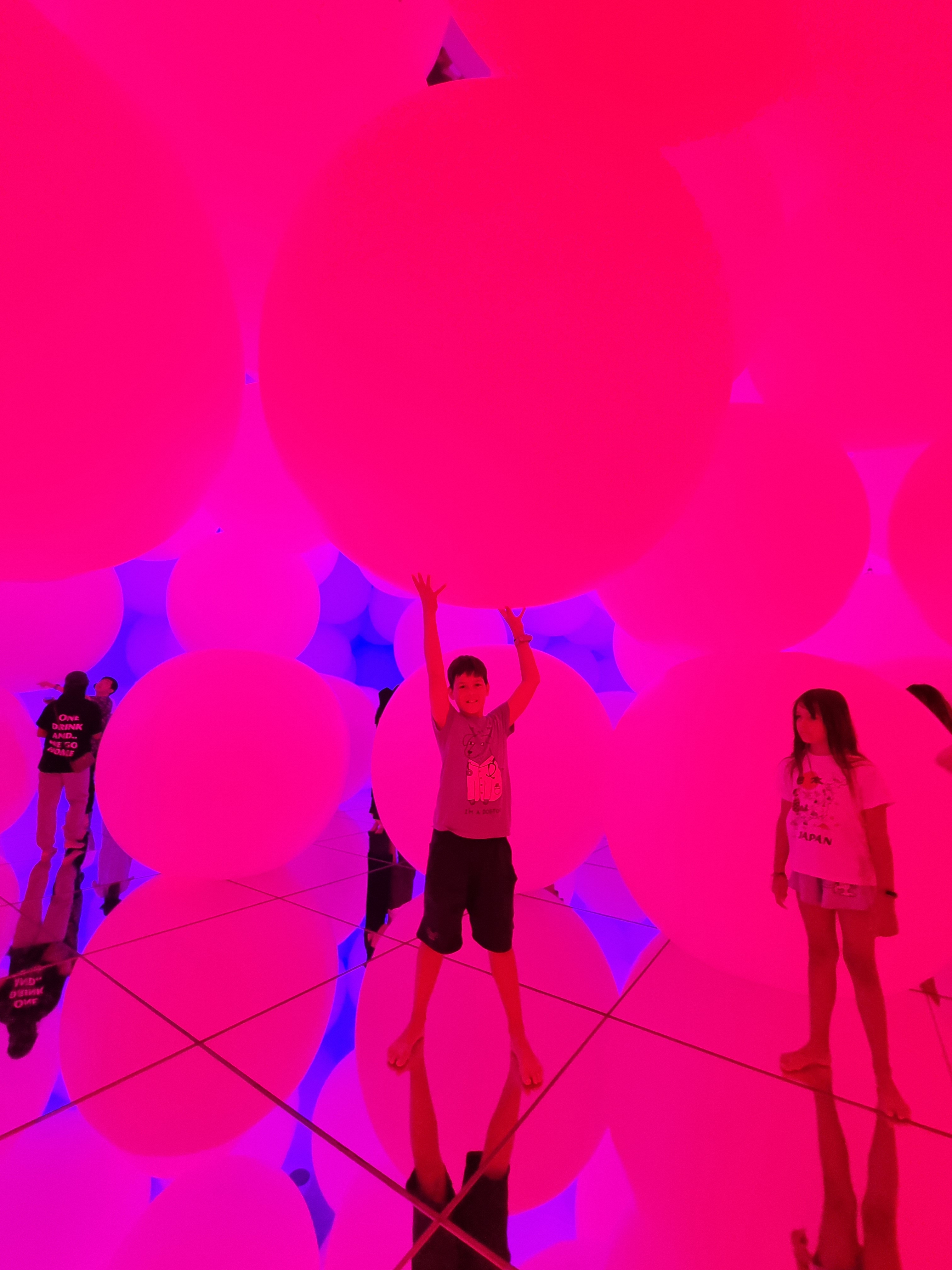 Na śniadaniu zeszło nam trochę dłużej niż planowałam (domawialiśmy dokładki), więc do kolejnego miejsca musieliśmy iść bardzo żwawym krokiem. Tokyo teamLab Planets, miejsce wymieniane jako „must see” podczas wizyty w Tokio. Kilka sal z różnymi instalacjami wizualnymi, dotykowymi i zapachowymi. Na początek zdejmujemy buty i skarpetki, a kto nie ma krótkich spodenek może je wypożyczyć na miejscu. Wejście potokiem do wodospadu, potem przejście przez poduchy, które okazało się wyzwaniem, następnie jezioro z neonowymi karpiami, wielkie kule zmieniające kolor pod wpływem dotyku, lewitacja wśród kwiatów (lustrzana podłoga odbijająca wizualizacje wyświetlane na kopule – błędnik szalał od razu) to atrakcje sekcji wodnej. Niesamowite wrażenia i doznania! Następnie 2 sale sekcji ogrodowej: srebrne jaja i pionowy ruchomy ogród kwiatowy średnio przypadły nam do gustu. Na szczęście czas nie był limitowany, więc wróciliśmy do sekcji wodnej, by doświadczyć jej jeszcze raz 😀