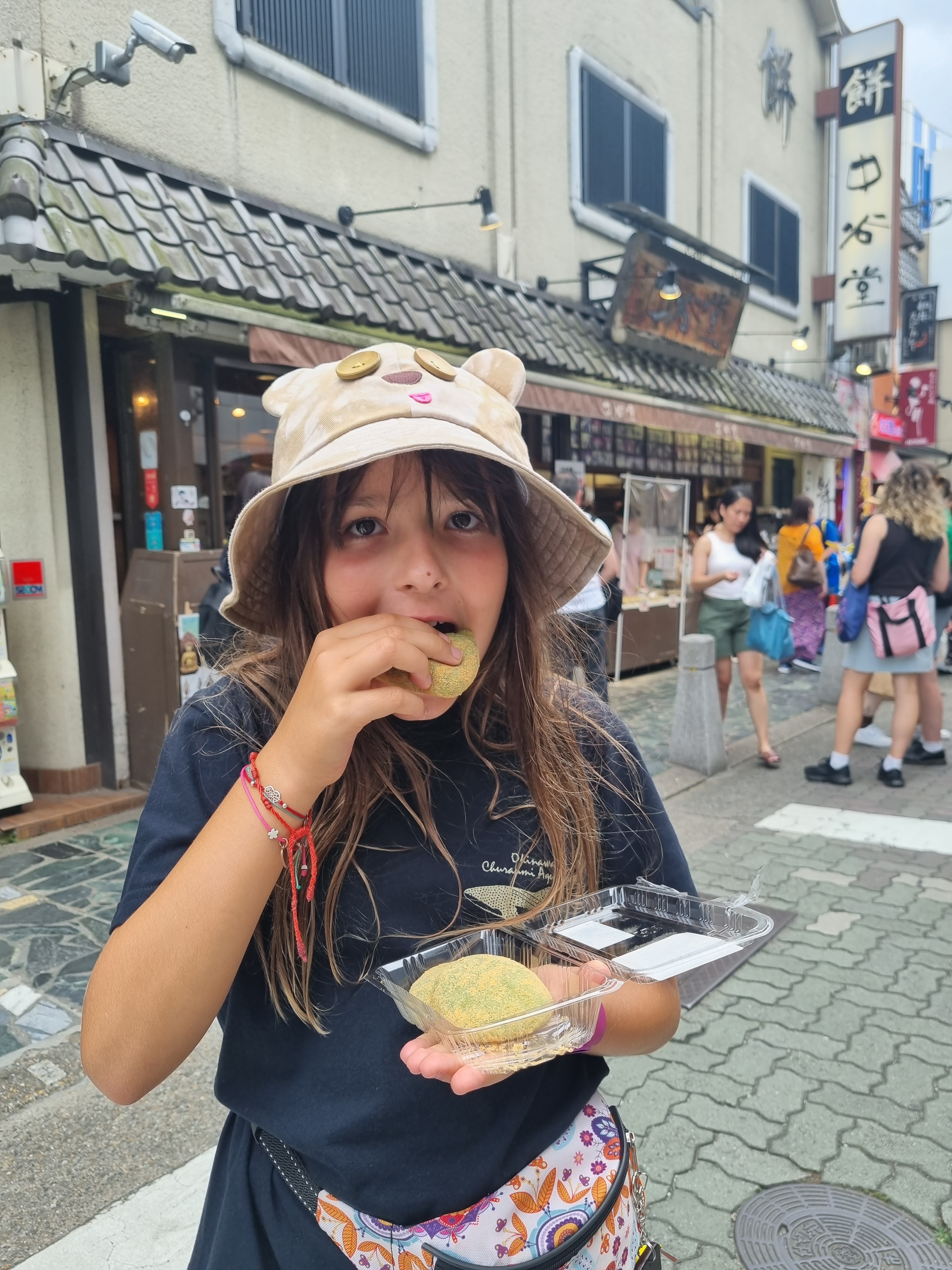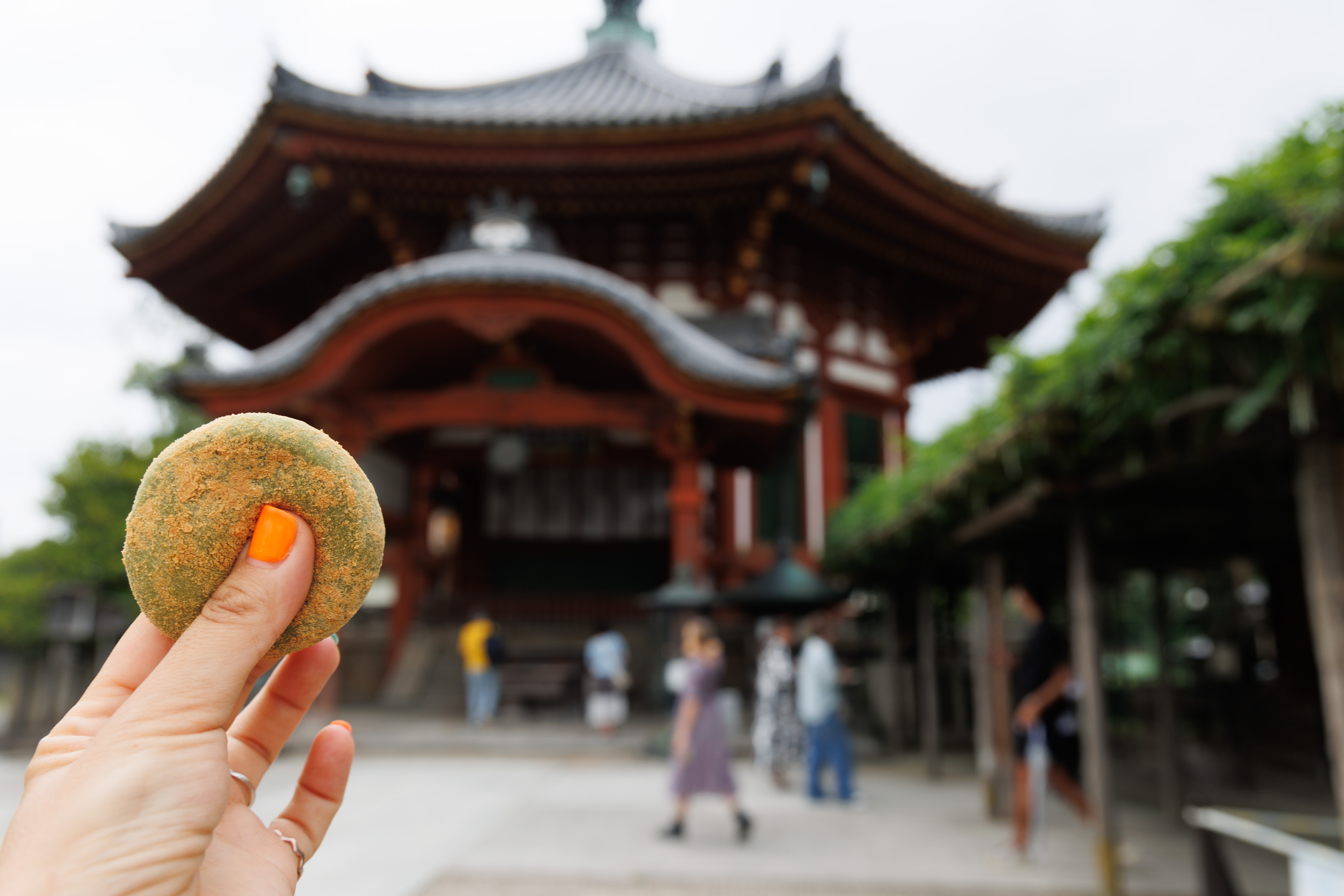 Przeładowani doznaniami pojechaliśmy do Nary pokarmić żyjące w parku jelonki i zobaczyć proces przygotowywania daifukumochi, bardzo często pokazywany na Instagramie. Jak się okazało na miejscu, spóźniliśmy się na pokaz 😦 pozostało tylko spróbować mochi z pastą fasolową. Szczerze mówiąc nikomu nie przypadły do gustu