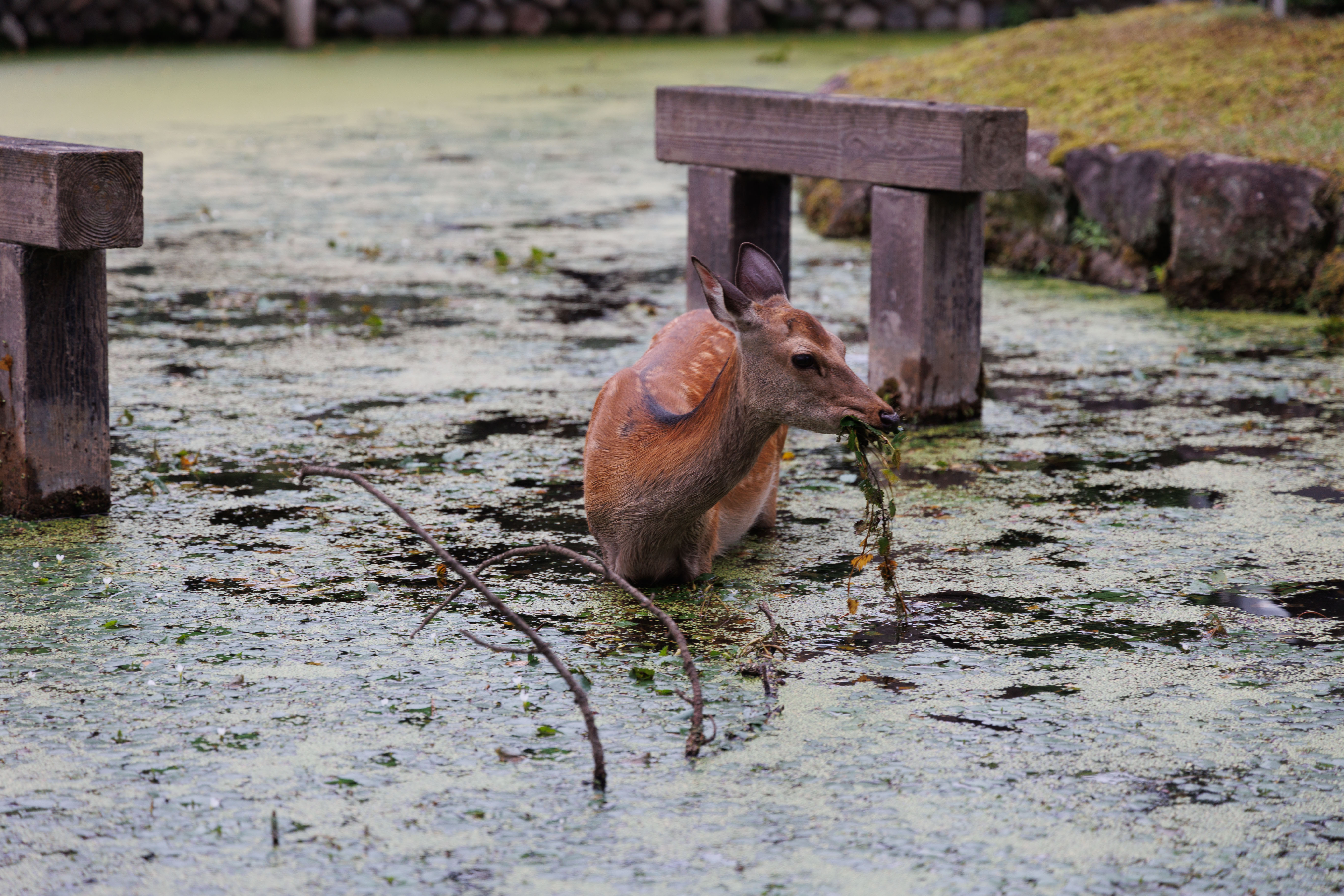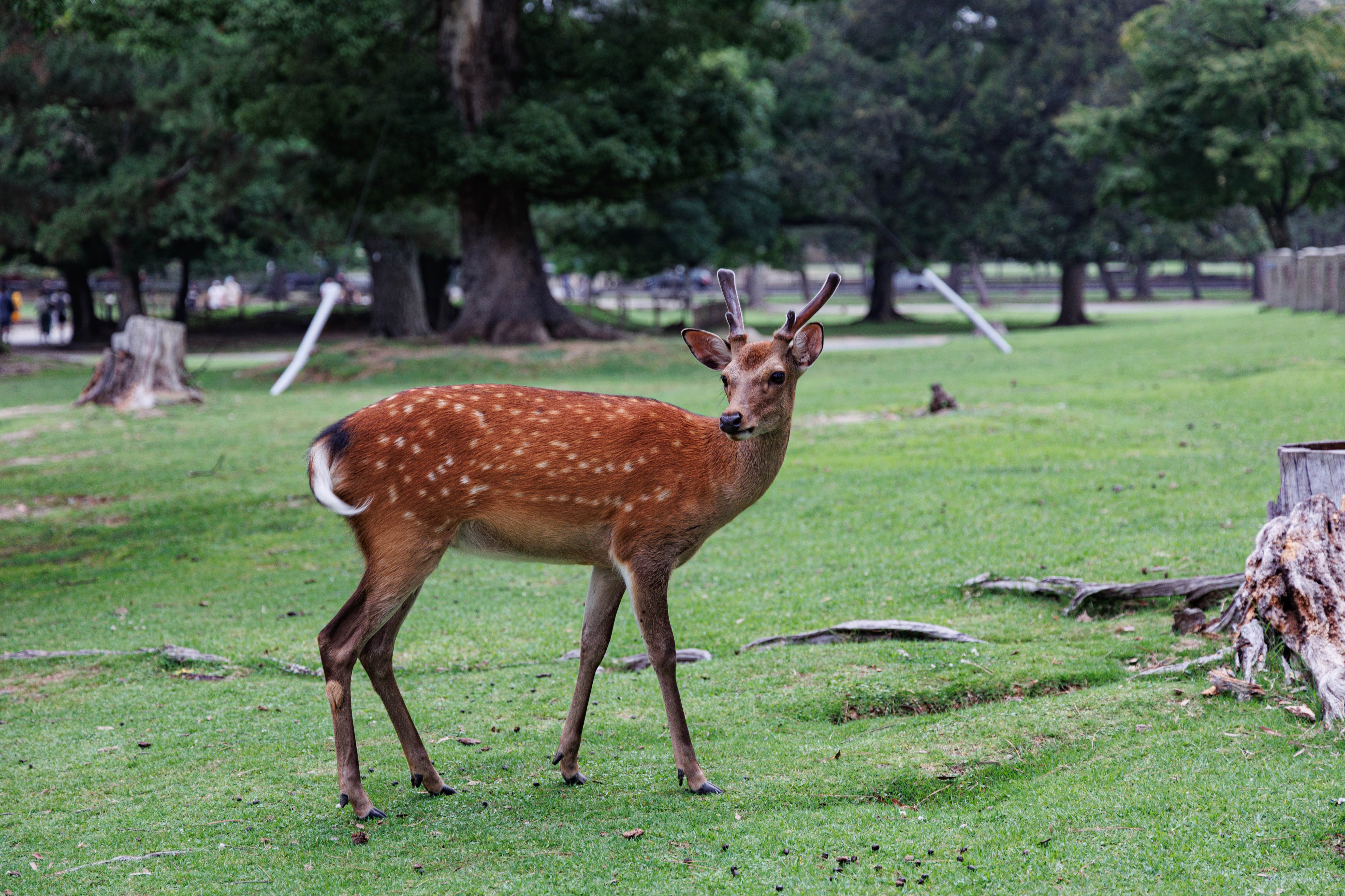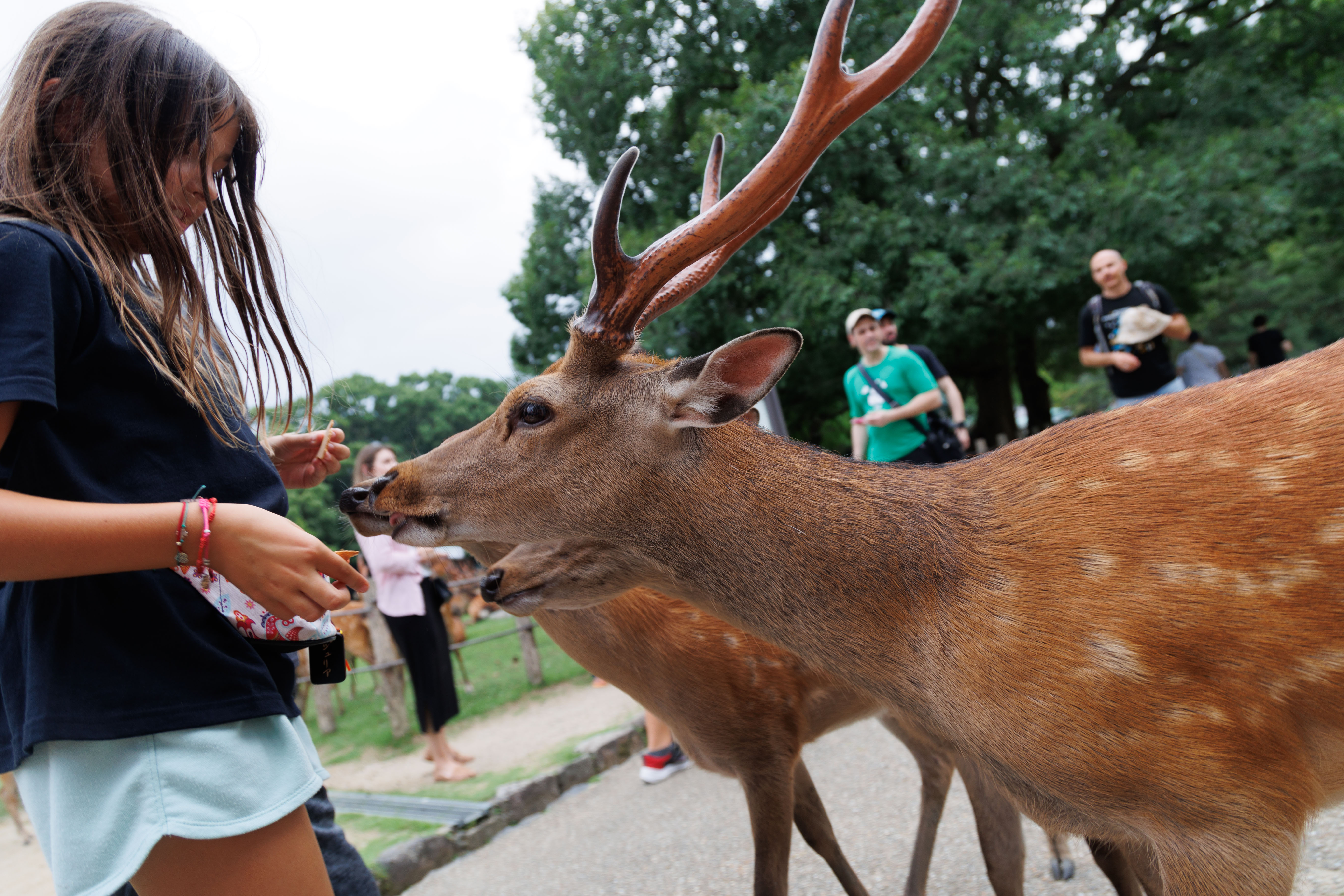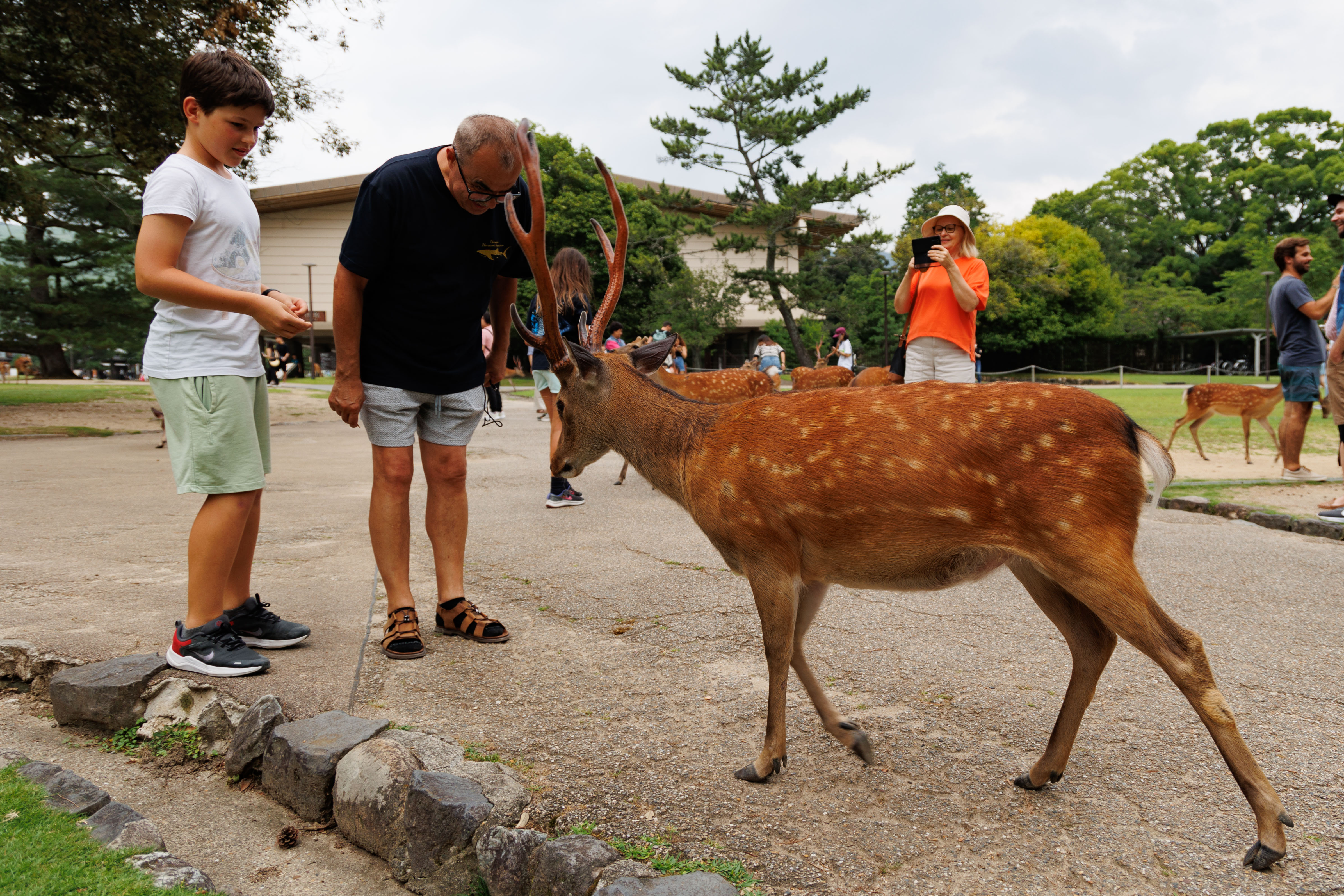 Następnie udaliśmy się w kierunku parku, w którym na wolności żyją jelenie. Po drodze zaopatrzyliśmy się w przysmaki, którymi można je karmić. Zwierzaki są oswojone i przyzwyczajone do tłumu turystów, ponadto są bardzo dobrze wychowane (filmiki). Przed skubnięciem przysmaku kłaniają się ładnie, a następnie kłaniają się dziękując 😉 Spryciarze chodzą za każdym kto je raz nakarmił i dopominają się kolejnych porcji, czasem skubiąc turystów po nogach, pośladkach czy plecakach. Tak się zajęliśmy jelonkami, że odpuściliśmy oglądanie kolejnej świątyni znajdującej się nieopodal.